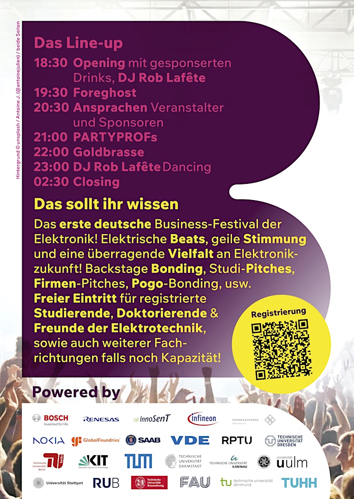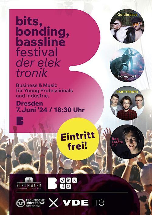 On June 7, 2024, the “bits, bonding, bassline festival” of electronics will take place for the first time. The event in Dresden is being organized by the ITG Informationstechnische Gesellschaft within VDE. The announcement states: “The first German business festival for electronics and computer science, and certainly one of the largest and most unique music events between the two worlds of young professionals and industry. This platform brings together students from different semesters as well as experts and managers from science, research and industry from all over Germany to share their interest in music and careers.