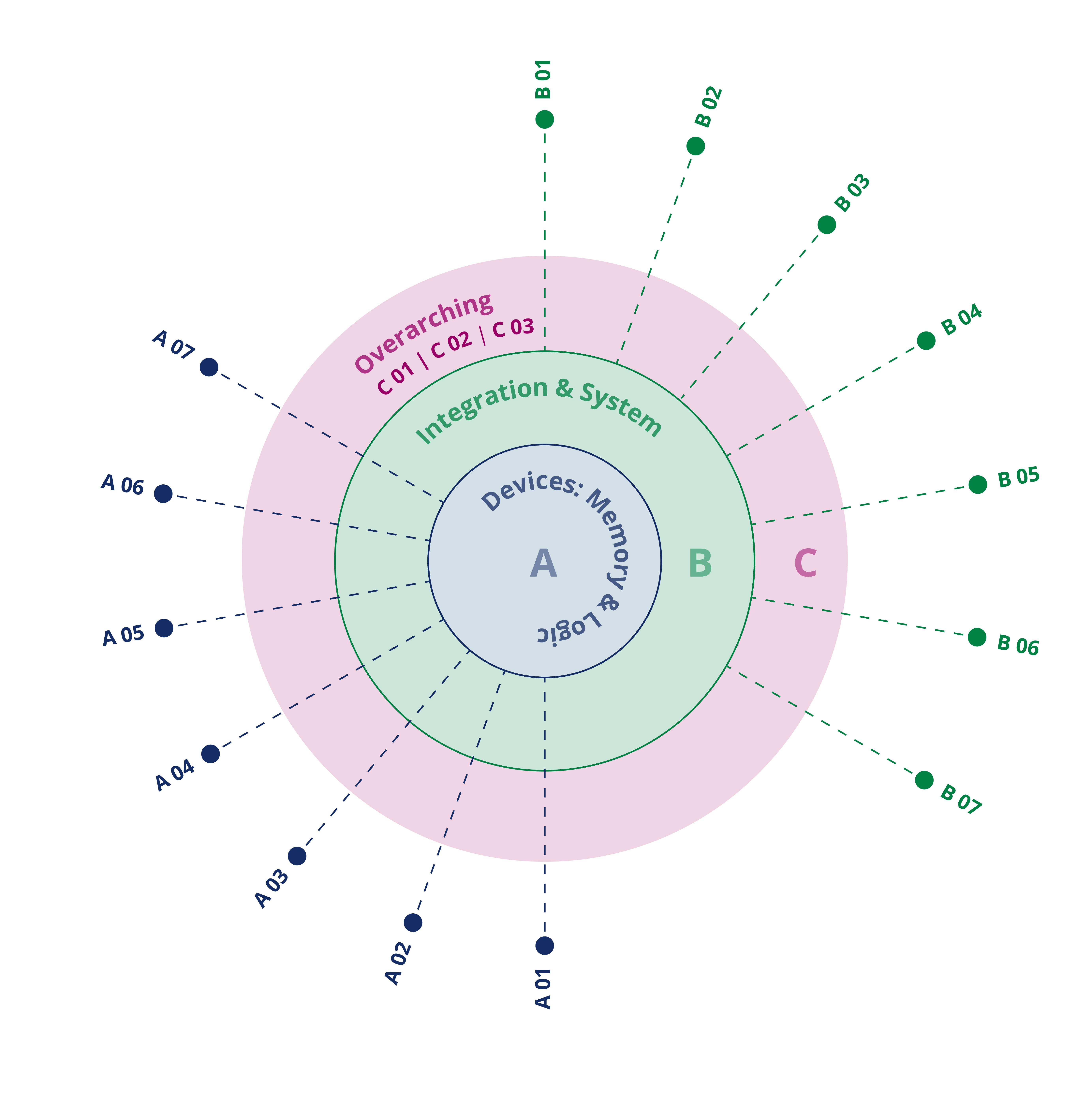 Memories and logic devices are required to build novel system architectures and will be studied in Research Area A. They need to be integrated to enable systems, which is the task of Research Area B. The complex tasks are connected and held together with the overarching projects of Research Area C.