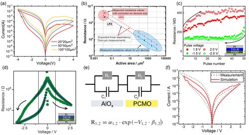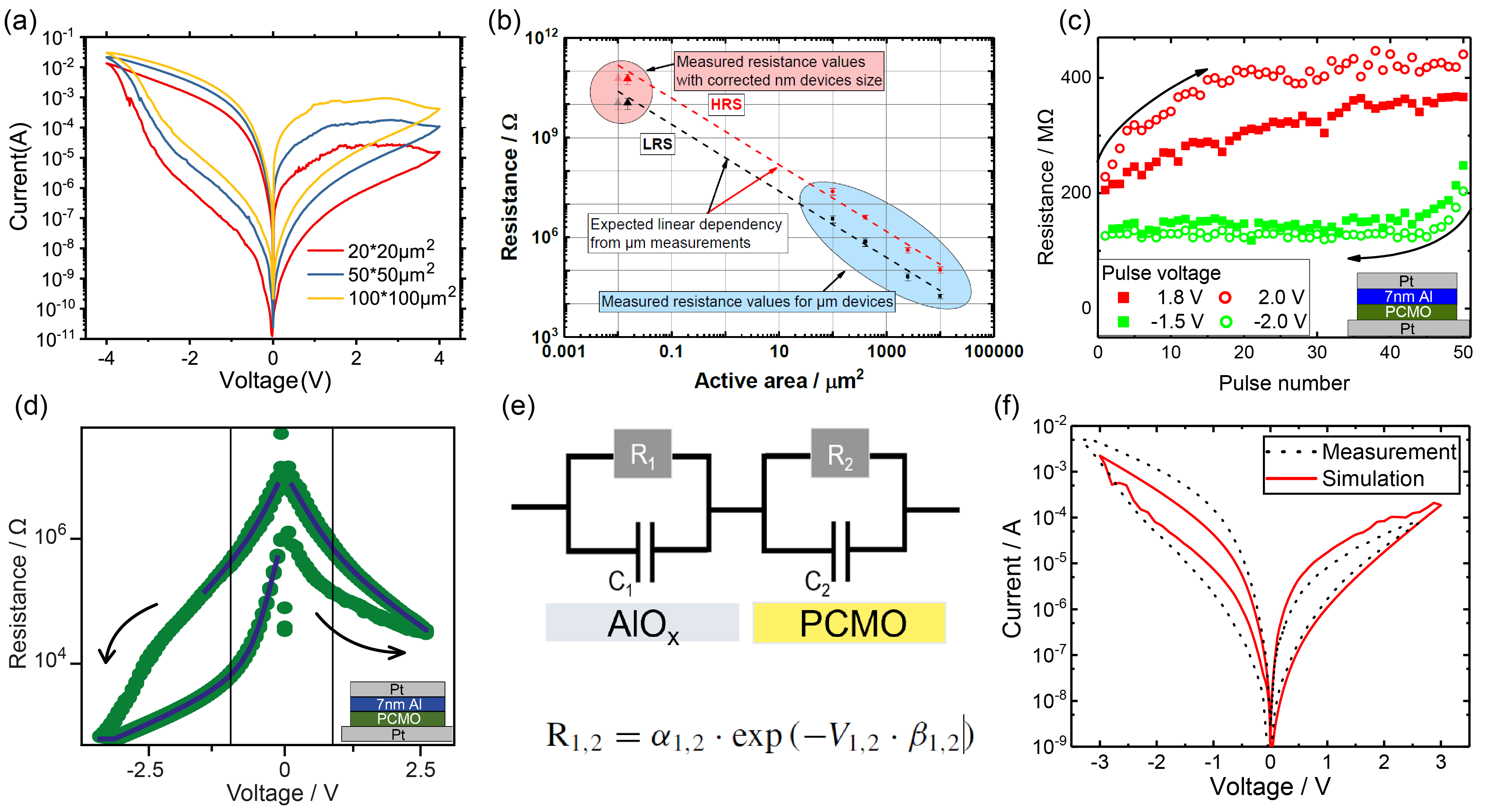 Current-voltage curve of PCMO/AlOx /Al devices with different area; (b) Scaling of the device resistance with the area from μm to nm scale; (c) Potentiation and Depression curves of PCMO/AlOx /Al devices for different pulse height [Gut+21]; (d) Current-voltage curve of a PCMO device; (e) The regions where no switching takes place are fitted by a two-resistor model with exponentially voltage-dependent resistance. In order to extract the dynamics the fitting procedure has been performed for different stop voltages; (f) The results from the fits in (d)/(e) are extrapolated to the whole voltage regime and implemented in Cadence -